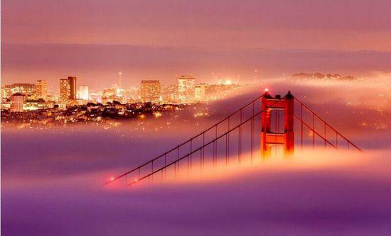 27岁来自瑞士的摄影师StefanForster拍摄到美国金门大桥梦幻一刻,在夕阳的余晖下,大雾突然涌入,感觉就像是天空向金门大桥打聚光灯一样美丽。
