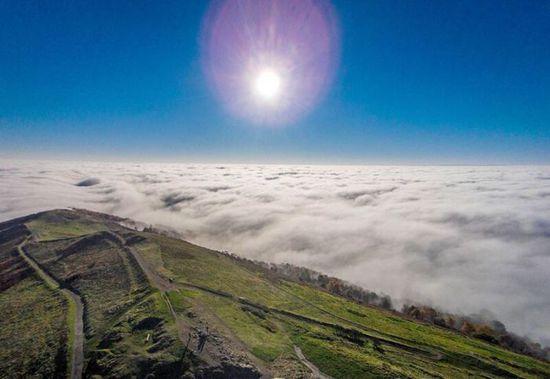 这样的天气走在路上是很不爽的,但一位聪明的摄影师却来到雾海之上,拍下了这些惊人的画面。来自英国伍斯特郡的DaveBright乘坐直升机登上比肯山脉的烽火台,整个伍斯特郡的乡村都被浓浓的雾海包围,场面极其壮观。