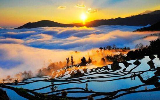 “一面面镜子,顺着山坡,妥妥贴贴地铺展开去。田埂上刚发芽的青草,一圈圈一道道,为镜子镶上了翠绿的镜框。”在这里,新人们不看星星,就可独享韩剧里童话般的浪漫爱情;不出国门,就能感受马尔代夫的异域风情;不玩穿越照样体验桃花源的田园乐趣。2013年2月19日,云南元阳哈尼梯田在晨雾中显得美轮美奂,绝美曲线成就千年仙境,鬼斧神工好似大地雕刻画。