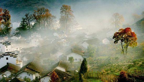江西省婺源县大鄣山乡石城村初冬时的美丽景色。时下正值初冬时节,在江西省婺源县的乡村层林尽染,五彩缤纷的树叶与萦绕飘逸的晨雾相应成景,宛如人间仙景,美不胜收。