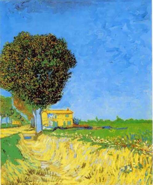 在阿尔的烈日下,一切的色彩都变了,有时候看出去,湛蓝的天空是黑的,碧绿的田野成了血红色……当狂暴的西北风刮起来时,树枝、草丛、房屋甚至行走或站立的人们都晃动扭曲起来……阿尔人总是见到一个不戴帽子的异乡男人早出晚归,背着画板流连各处,这在他们看来是“作死”的节奏,他们管他叫“红头发的疯子。”