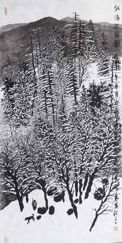 在创作技法上,我采用了最具中国水墨特征的留白法来表现雪的质感。我把最浓重的笔墨都用在了林间和远山上,这也是我在创作中对“道”的理解与阐述。用含水较多的墨色表现远山,使其在单纯中透出丰富微妙的变化,也与近处的山林形成了虚与实、浑浊与清净的对比关系。这也是天地万物之间的关系,浑然一体又各自独立,这恰恰也是绘画的魅力所在。
